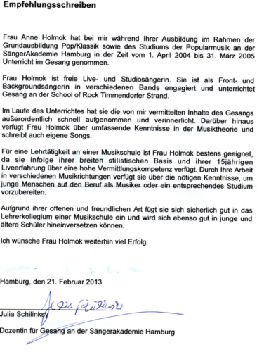 Ich bin Anne Live!, ausgebildete Sängerin im Popularbereich (Rock, Pop, Soul, Jazz, uvm) erfahrene Sängerin und Gesangslehrerin im RockPop Bereich. Ich habe Populargesang an der Sängerakademie Hamburg studiert, stehe seit ca. 20 Jahren auf Deutschlands Bühnen und unterrichte auch schon über 20 Jahre. In meinem Unterricht erlernst Du die richtige Atemtechnik und Körperhaltung, genaues Hören, Intonation, Stimmsitz und Du lernst den Gesangsapparat Deines Körpers kennen, um eine gesunde, kräftige Stimme zu entwickeln.
